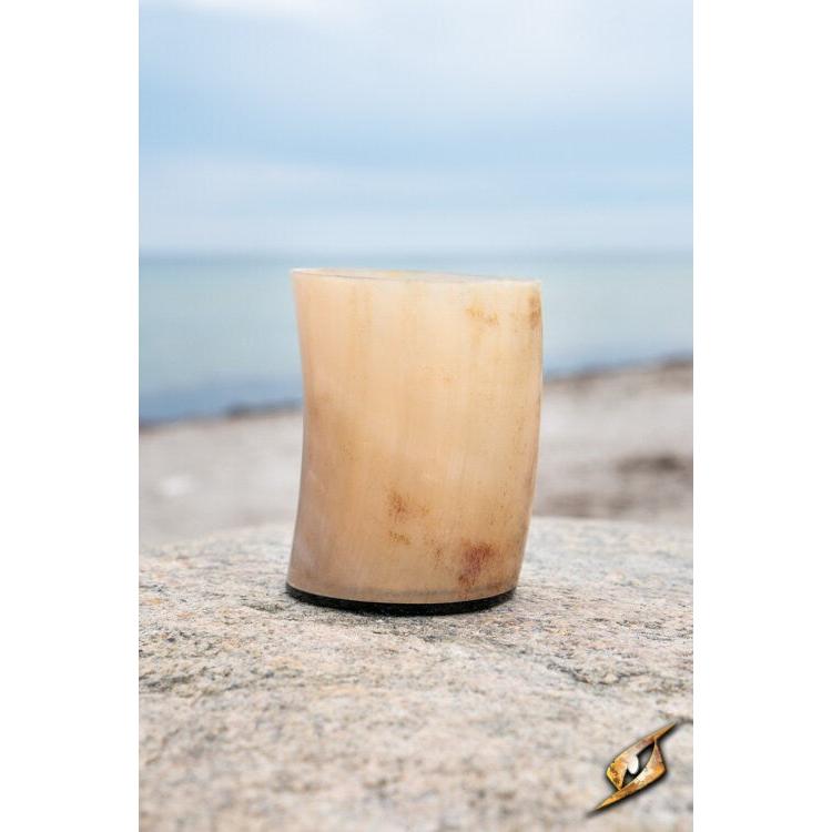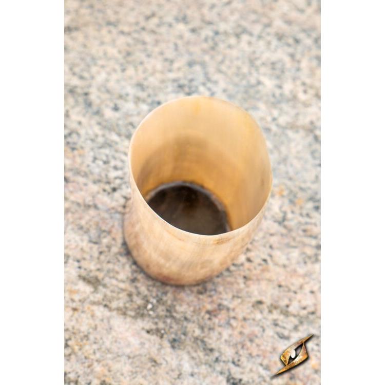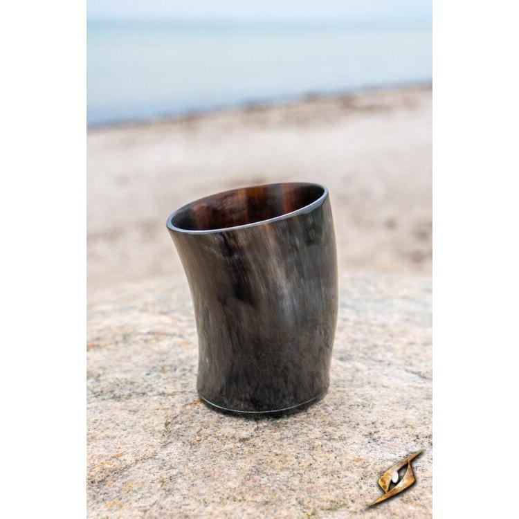 The Dark Trader Horn Cup from Epic Armoury is a carefully hand-made cup formed from a single piece of horn. It was cut to length, polished by hand, cleaned and sealed inside. Guaranteeing the Larper that this period-appropriate drinking vessel is odourless and safe to drink from. Each medieval cup has a wood base for extra sturdiness when visiting a tavern, and the natural horn look will immediately fit the role. Because it is a natural horn product, each vessel's shape and the colour is unique and may differ from the picture. Use this cup at any medieval marriage, roleplay event or renaissance faire.