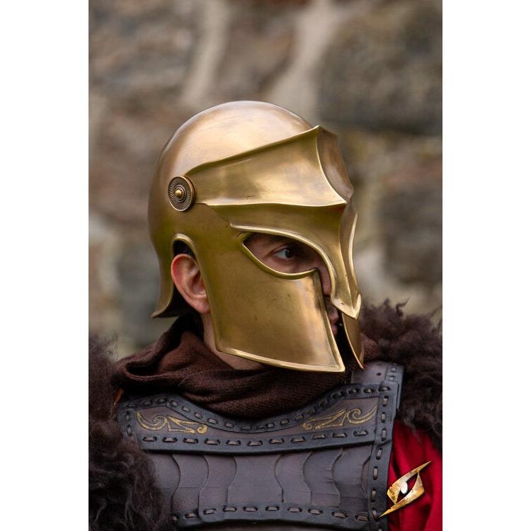 Behold the Corinthian Helmet, a modern homage to the storied helm of ancient warriors, reborn with a visor for the modern fighter. Crafted for clarity and breathability, the visor lifts with ease, offering both protection and a welcome gust of air in the throes of battle. It cradles the head in comfort, complete with adjustable leather straps and plush, removable padding, customizable to the bearer's preference. Fasten it beneath the chin, and feel the security of the meticulously fashioned mild steel. Its endurance is the stuff of legend, maintained with the devoted care of ancient metal craft.
