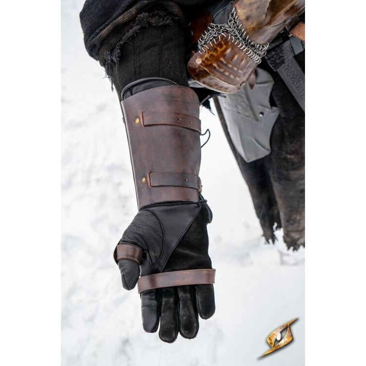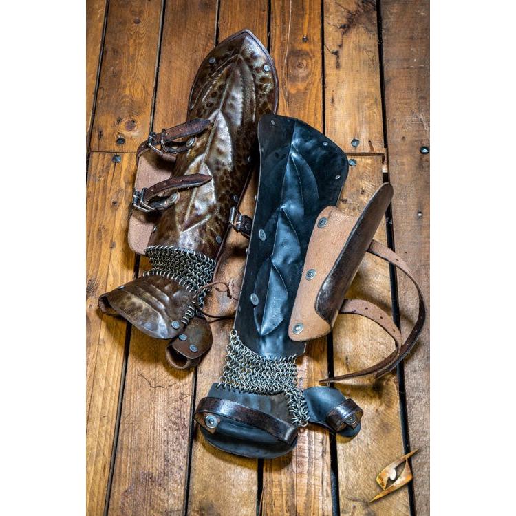 Epic Armoury’s Raider Bracers is a combination of vambrace and hand-plate connected with a chainmail underneath. Paired with your own leather glove, these robust rust covered steel plates efficiently protect the back of your hand, thumb, and underarm while strong chainmail connect the plates to ensure unbridled--but protected--movement. With a Dark and rusty appearance to give it a more evil and brutish look, these bracers would work perfectly with either Northern Marauders or Pillaging orcs.
